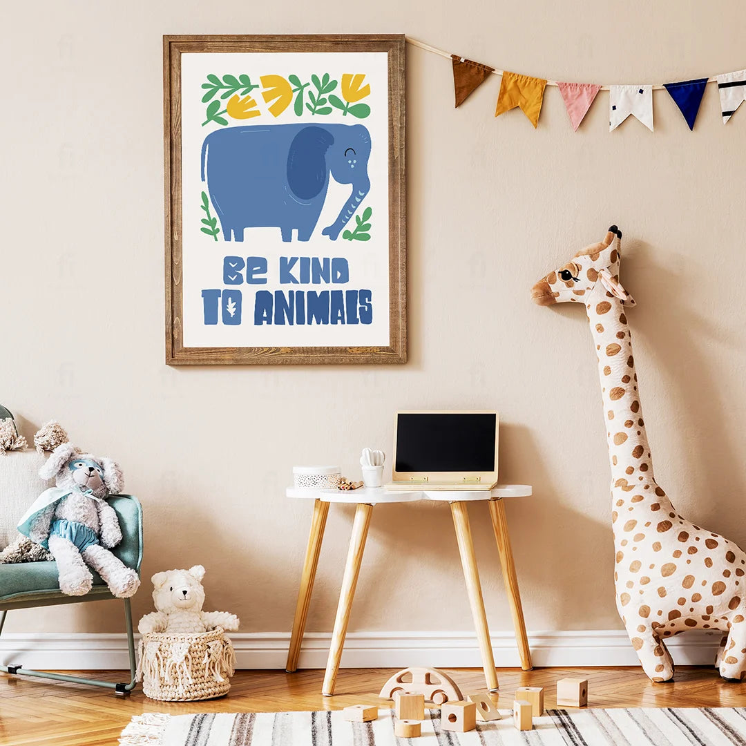 Add inspiration and color to a child's room with the "Be Kind to Animals" poster. Featuring an elephant surrounded by yellow and green flowers and the motivational message "Be Kind to Animals", it creates a positive atmosphere. Perfect for a child's room, nursery or play area, bringing a positive message.