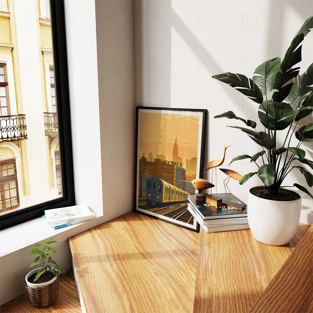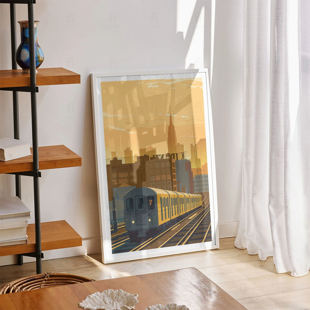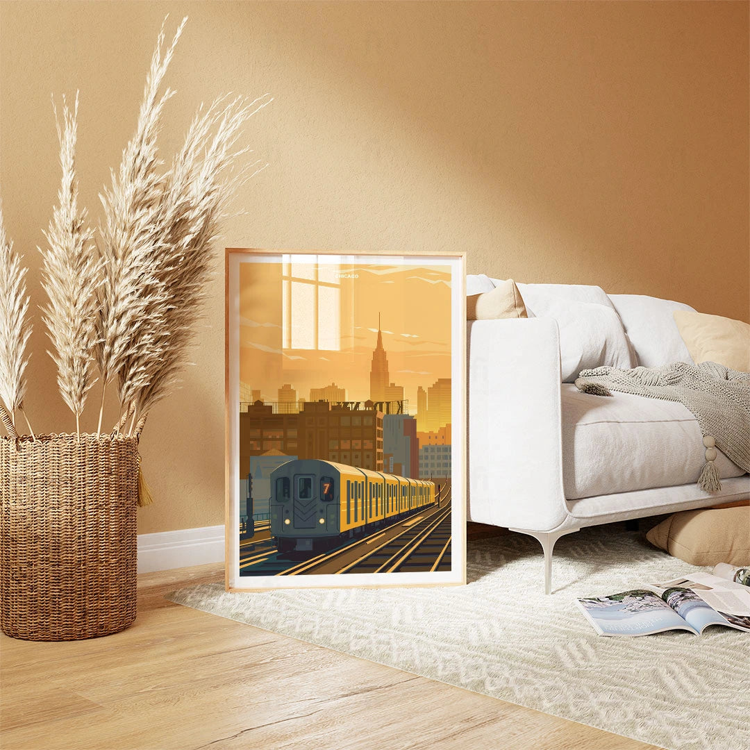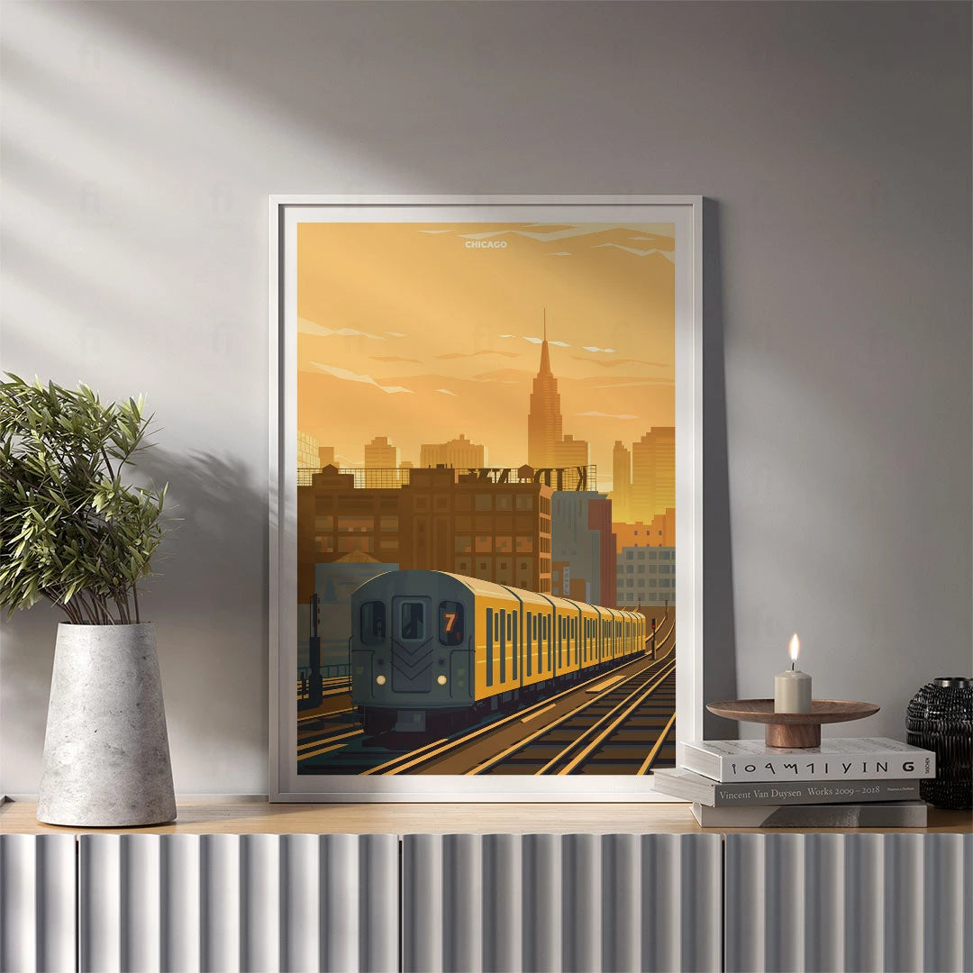 Discover the architectural elegance of Chicago with our poster of the iconic L train passing through the city at sunset. Perfect for anyone who appreciates the urban landscape and dynamic spirit of American metropolises.