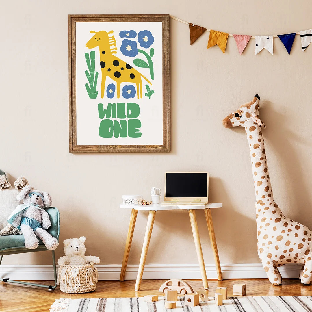 Liven up your child's room with the "Giraffe - Wild Spirit" poster. It depicts a giraffe surrounded by green plants and blue flowers, creating a wild and energetic atmosphere. Perfect for a child's room, nursery or play area, bringing adventure and energy to your little one's daily life.