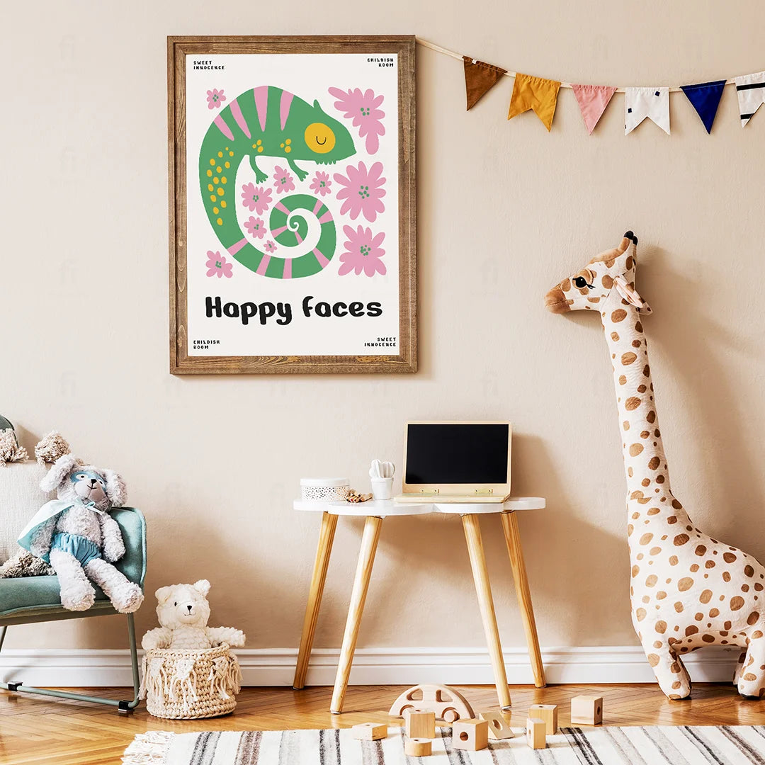Add a smile and color to your child's room with the "Happy Faces" poster. Featuring a colorful chameleon surrounded by pink flowers, it creates a cheerful atmosphere. Perfect for a child's room, nursery or play space, bringing joy and positive energy.