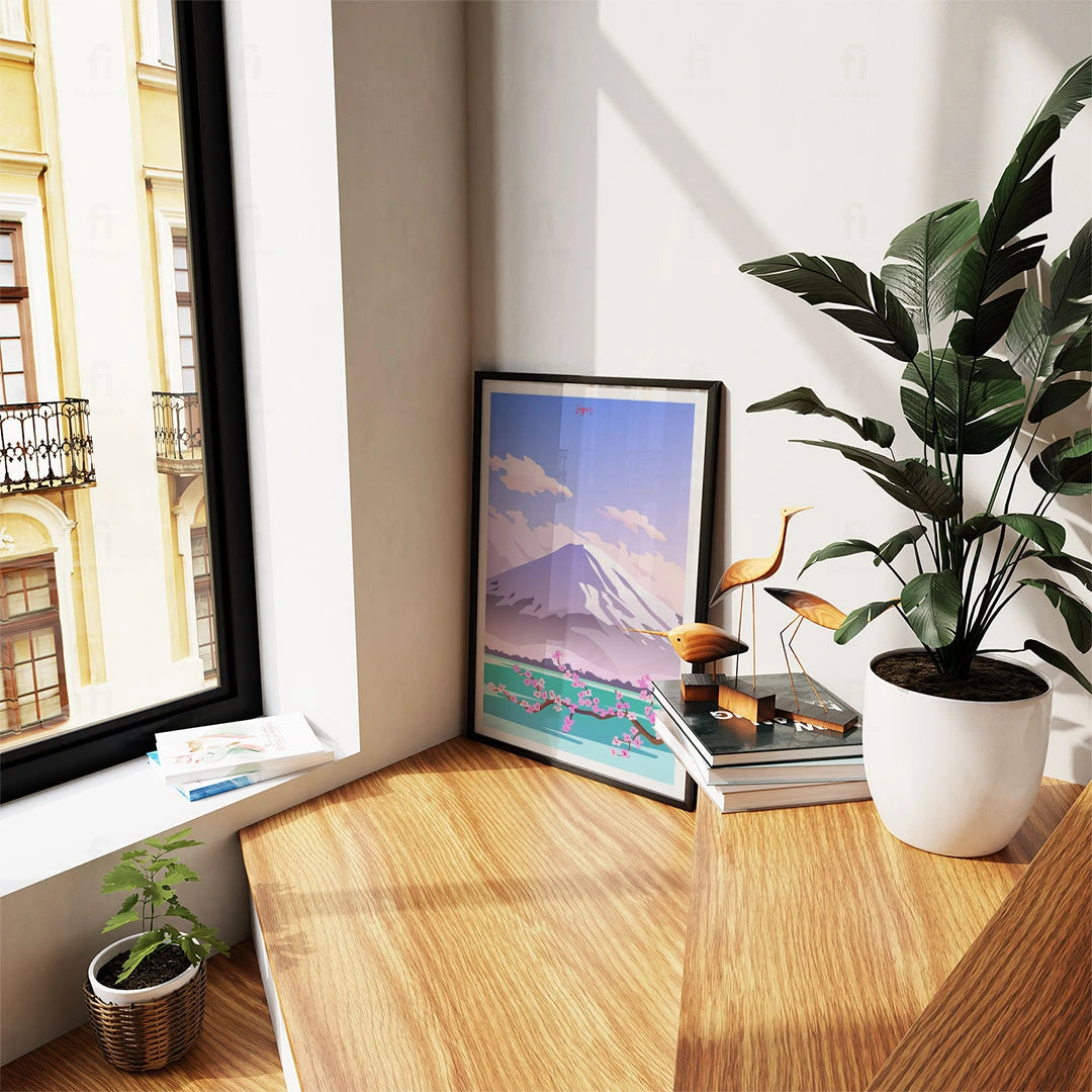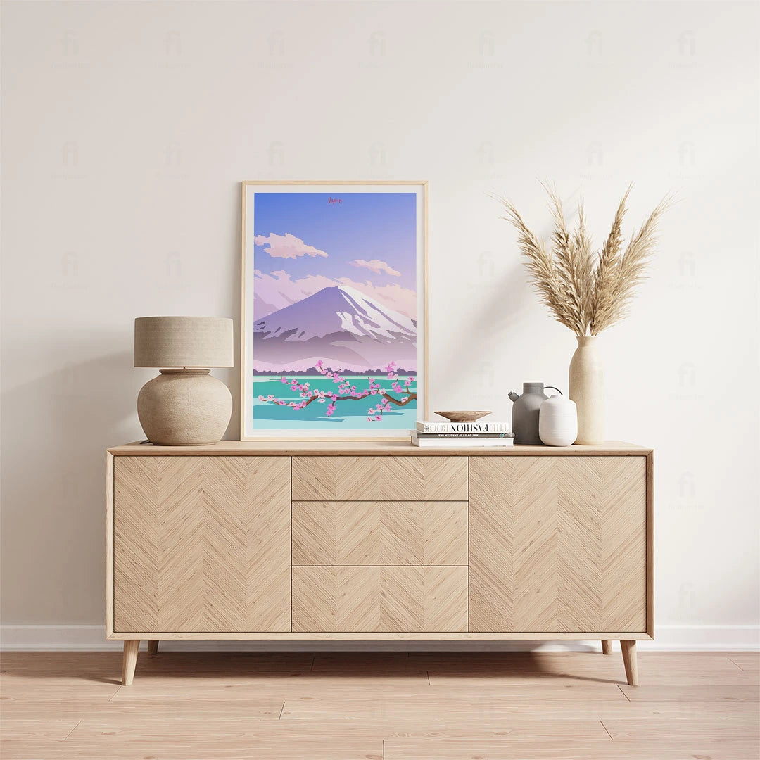 Enjoy the view of Mount Fuji with our poster, where the harmony of cherry blossoms and calm waters creates an image perfect for meditation and relaxation.