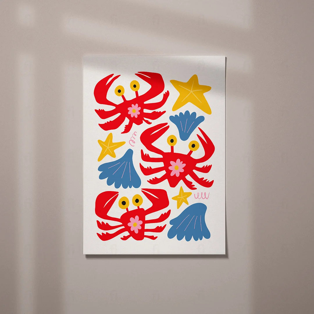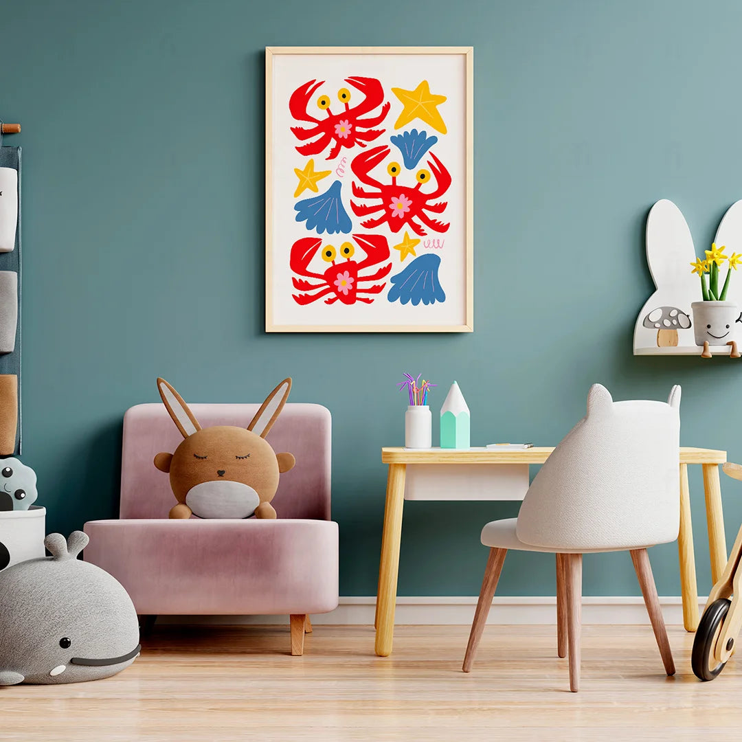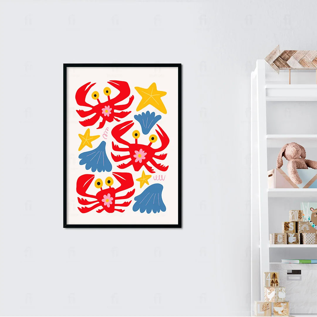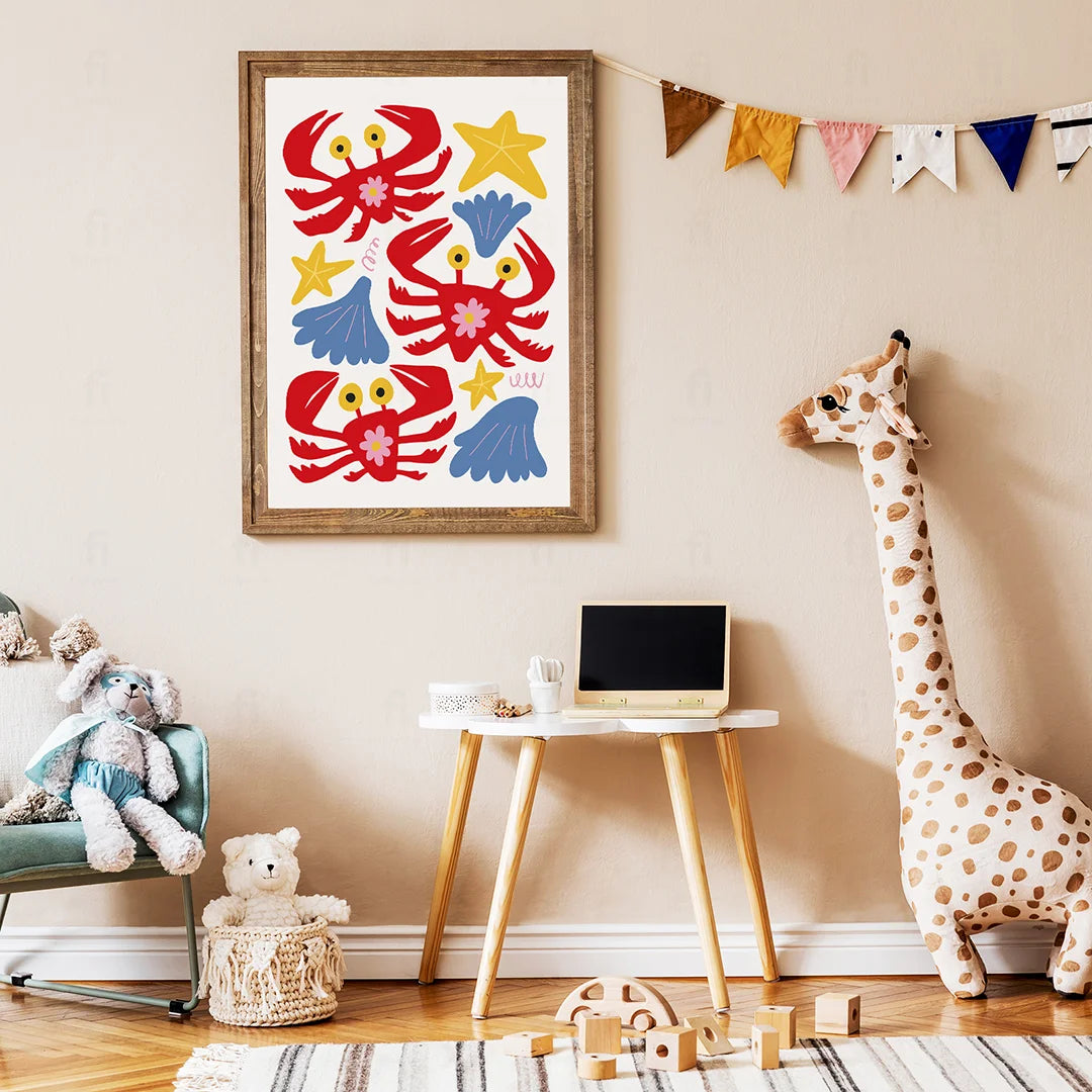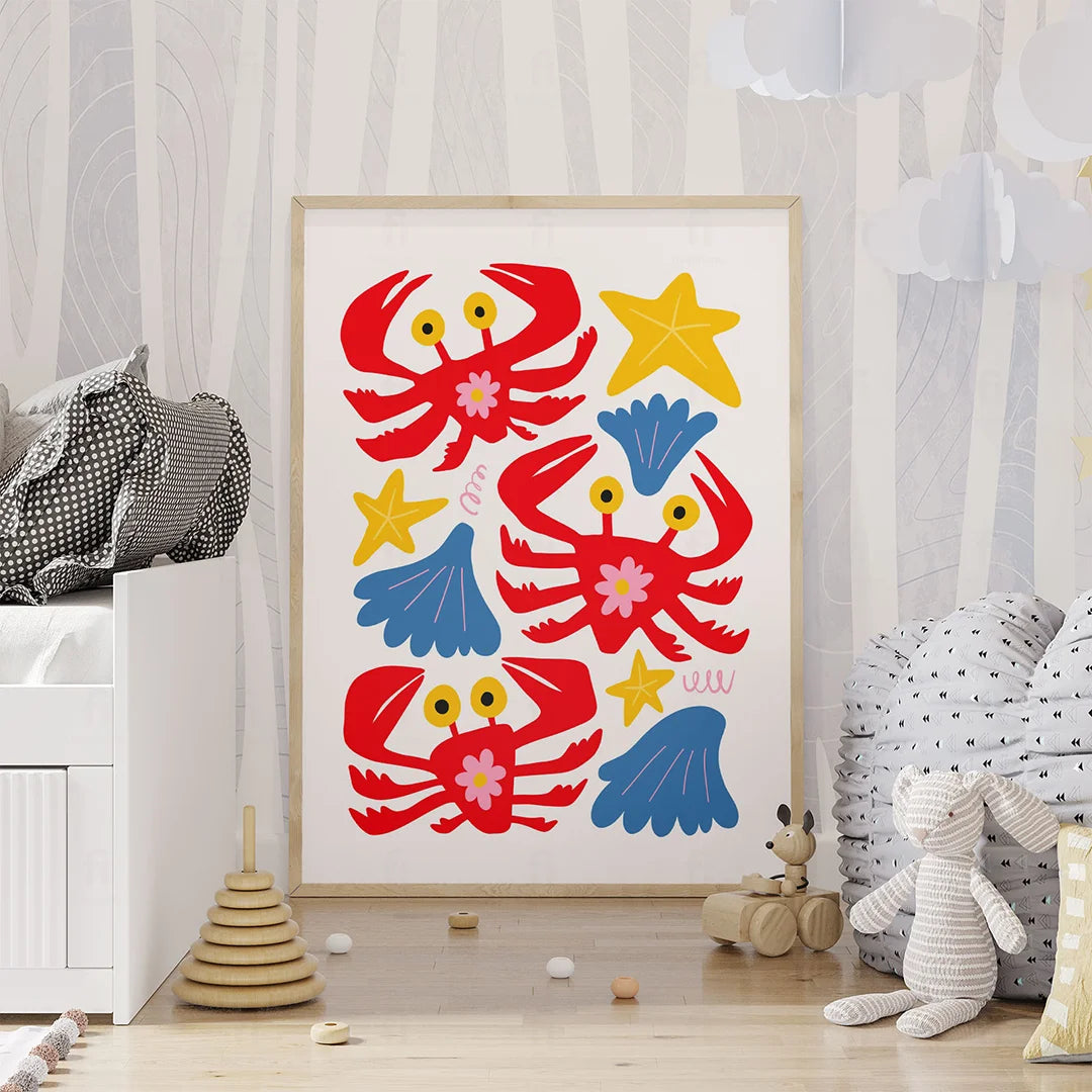 Add joy and color to a child's room with the "Colorful Crabs" poster. It depicts colorful crabs surrounded by shells and stars, creating a cheerful atmosphere.