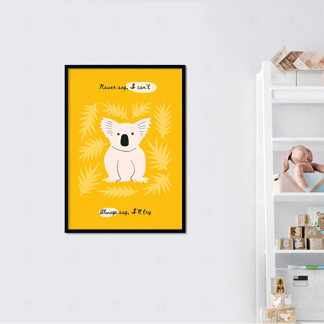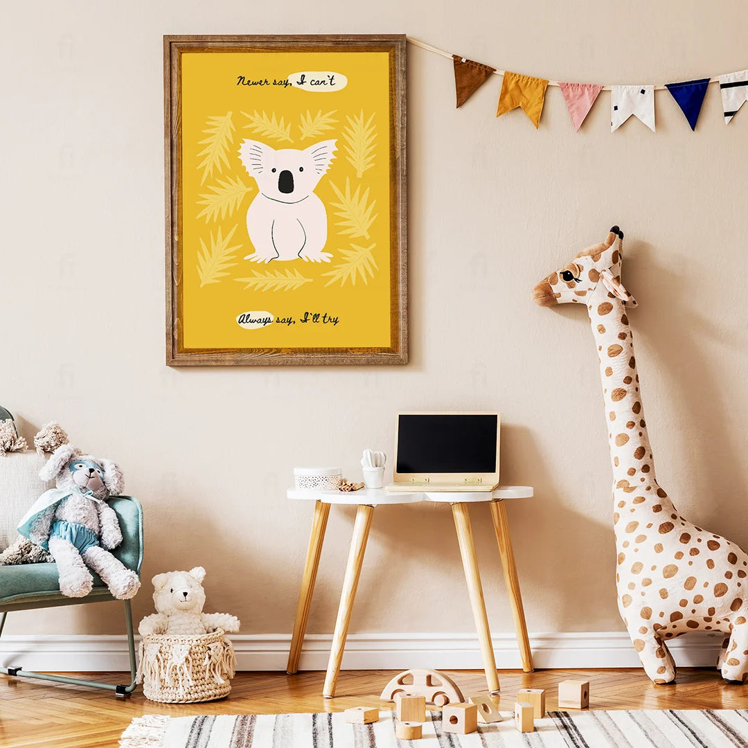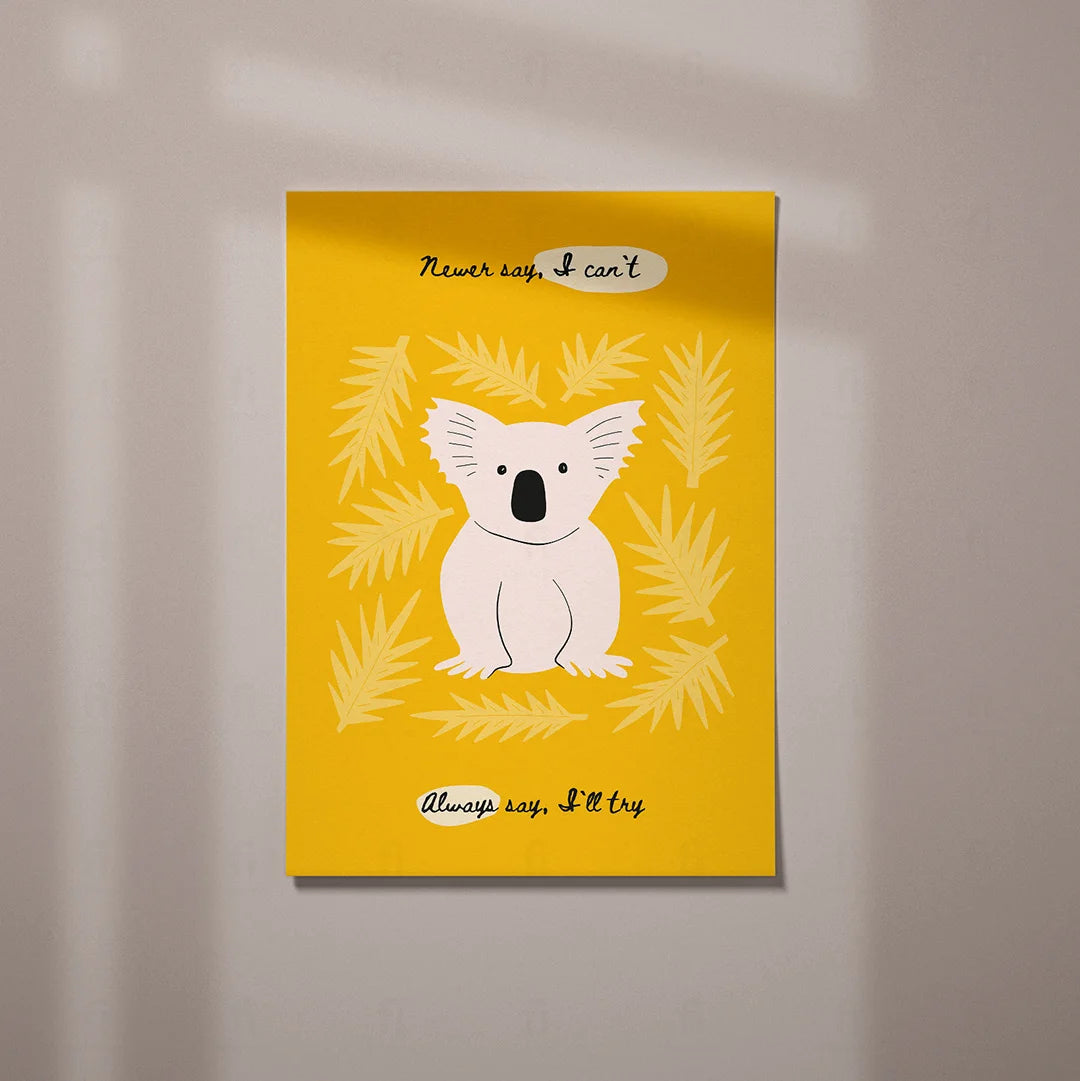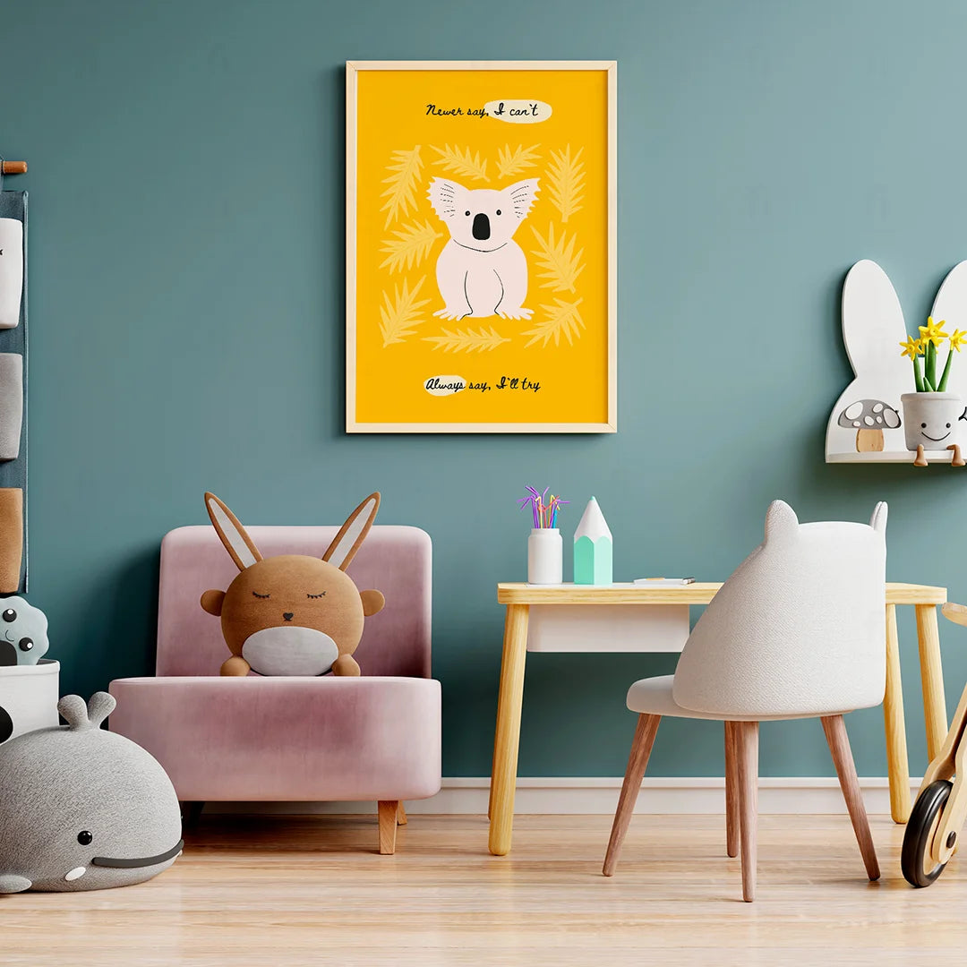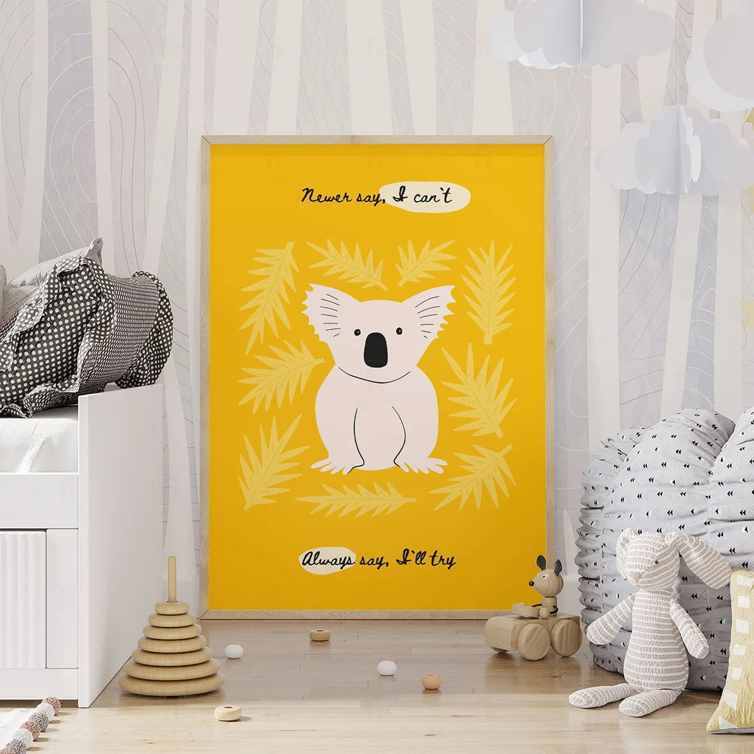 Add inspiration and color to your child's room with the "Motivational Koala - Always Try" poster. Featuring a cute koala surrounded by leaves on a bright yellow background, the motivational message "Never say, I can't. Always say, I'll try" creates a positive and encouraging atmosphere.