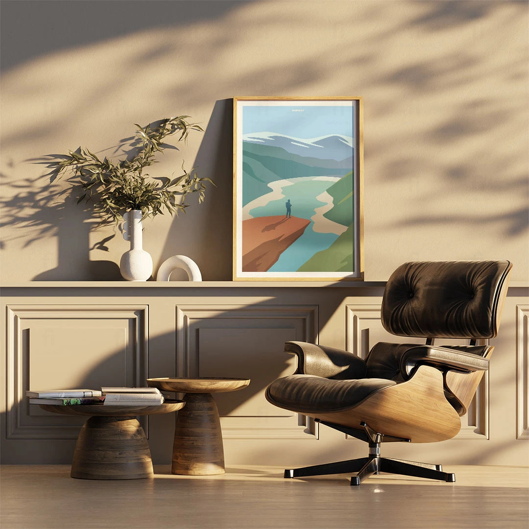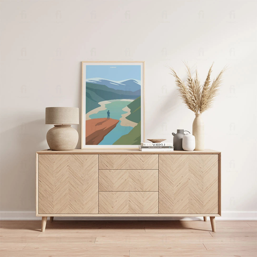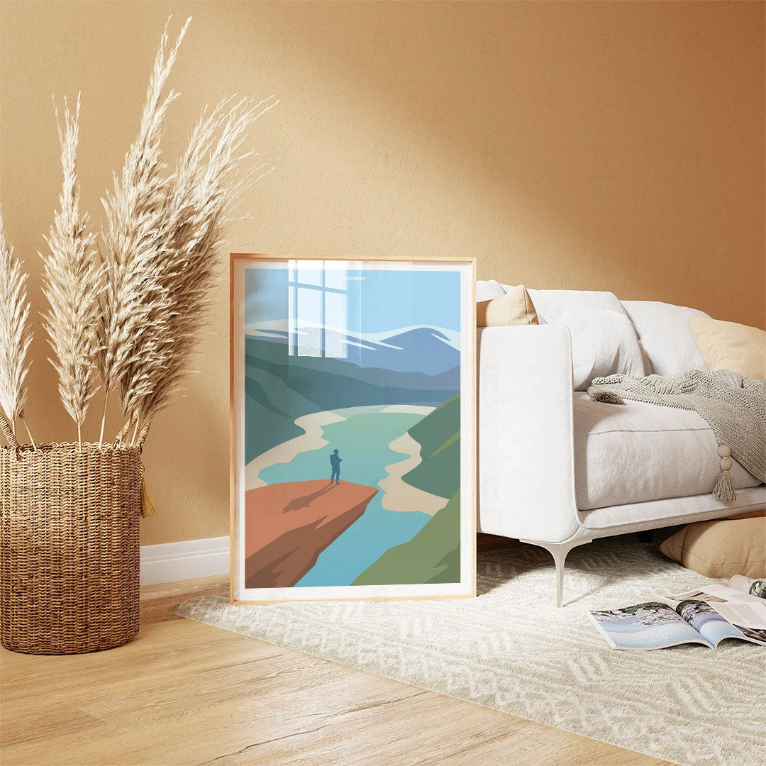 Immerse yourself in the spectacular landscape of Norway with this poster, featuring stunning fjords and steep cliffs. Perfect for lovers of Scandinavian nature and dramatic landscapes.