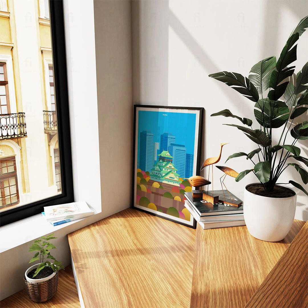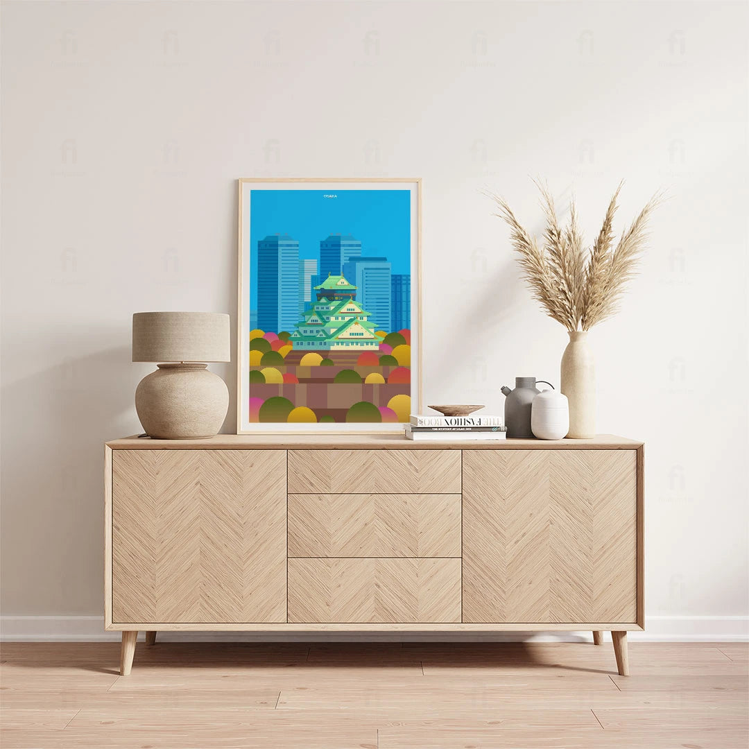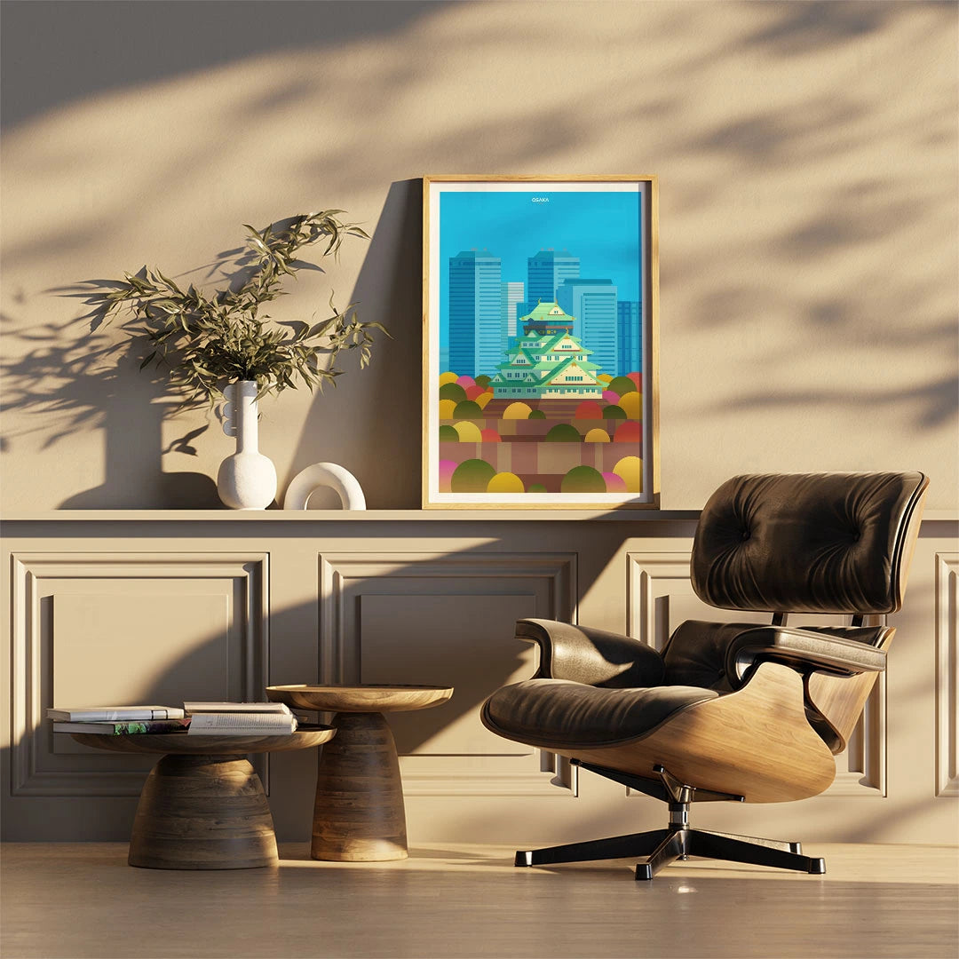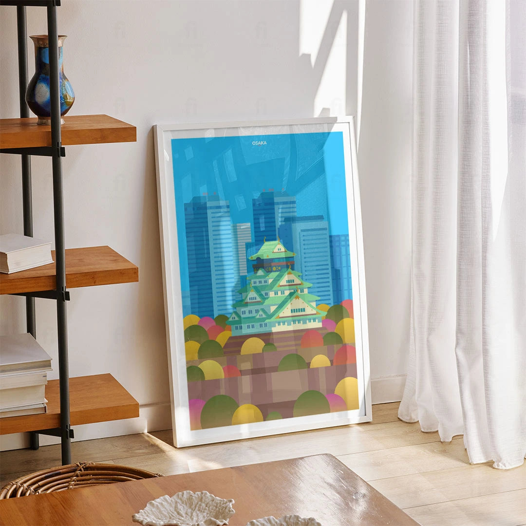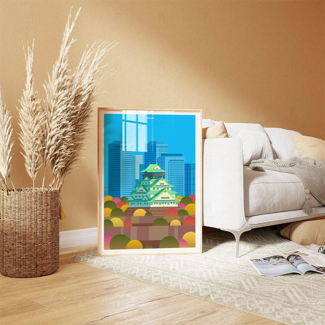 Enjoy a colorful representation of Osaka, with its iconic castle surrounded by modern skyscrapers and autumn colors. Perfect for lovers of Japanese architecture and urban planning.