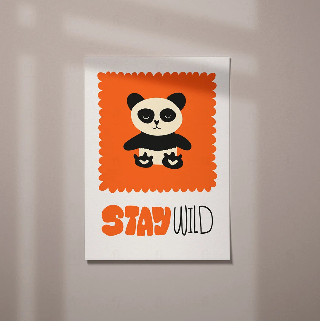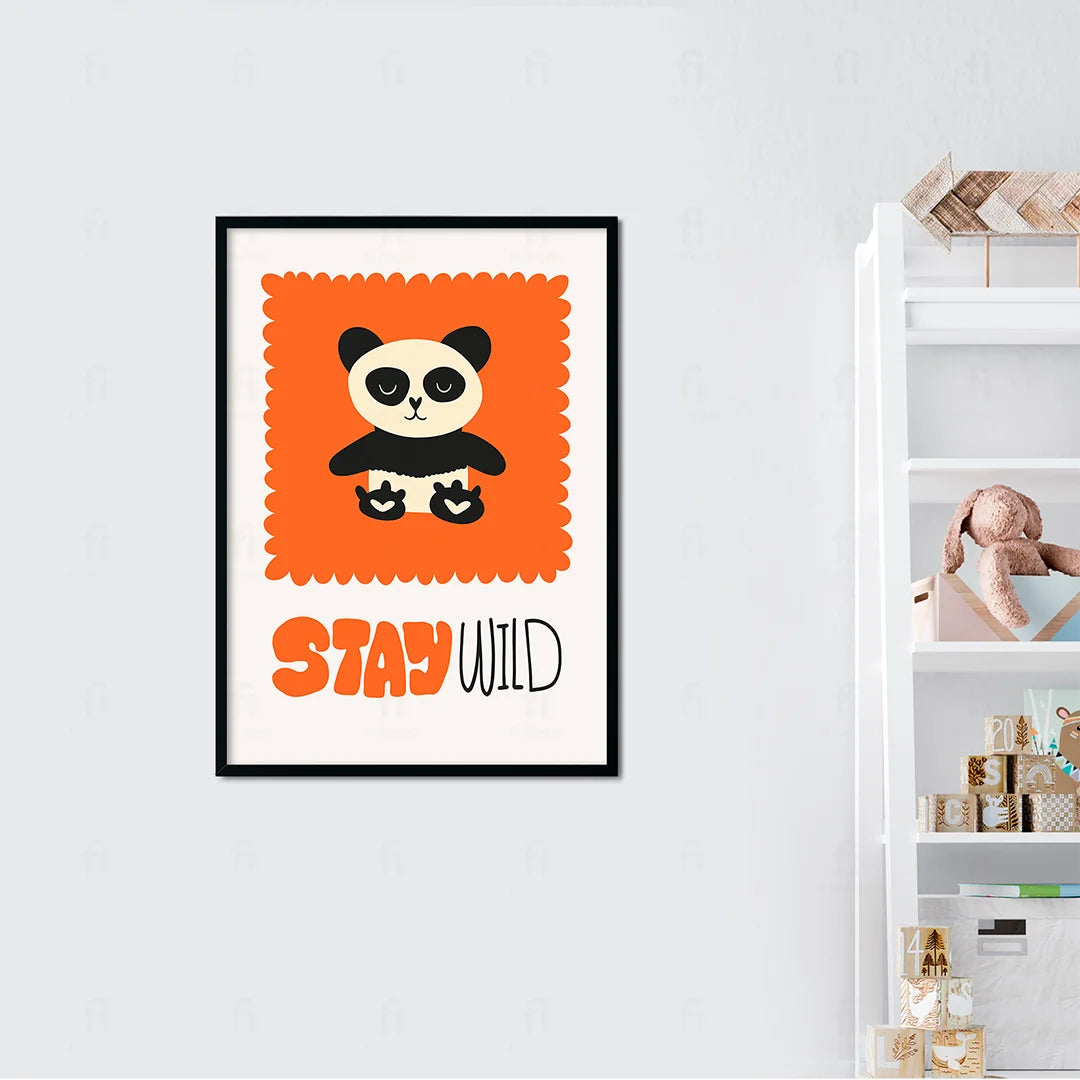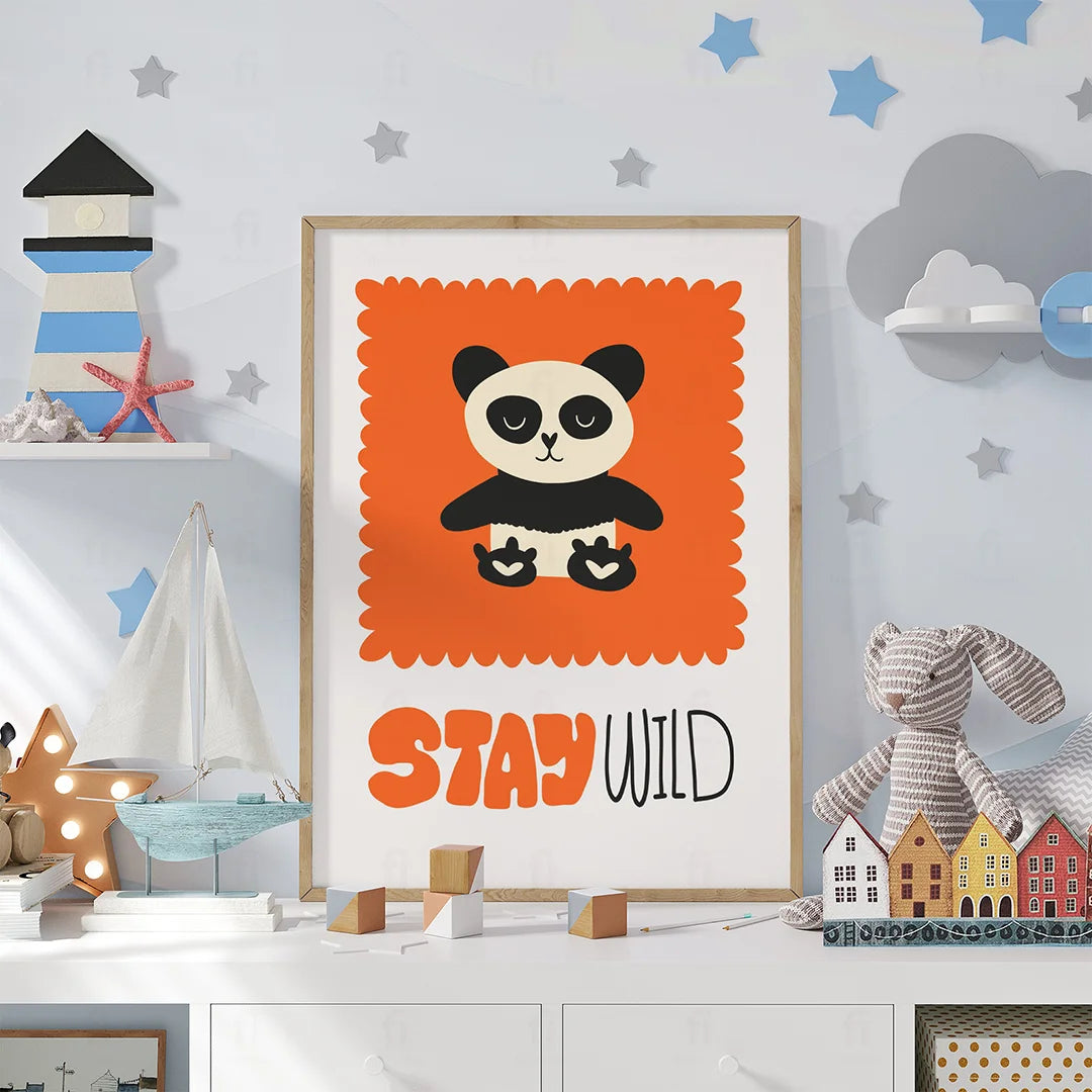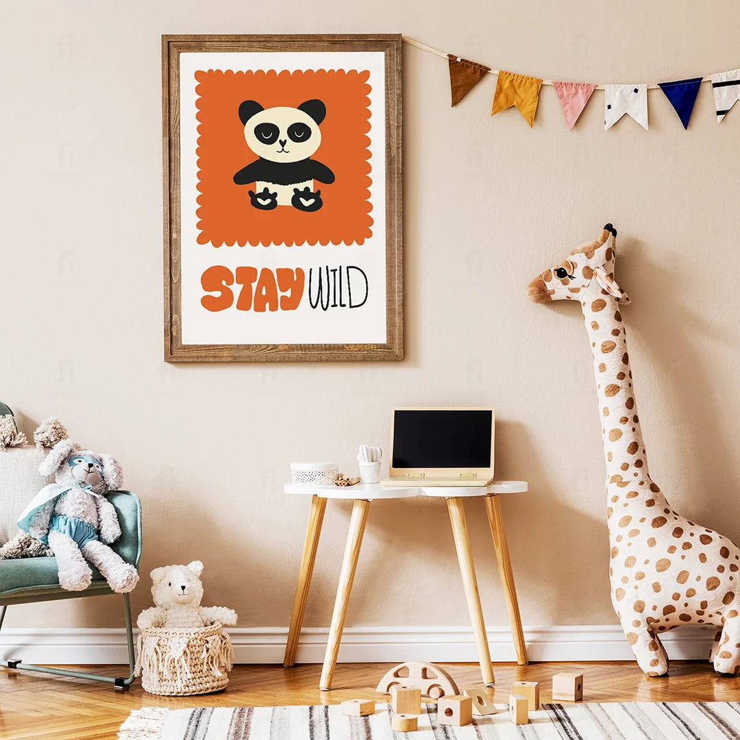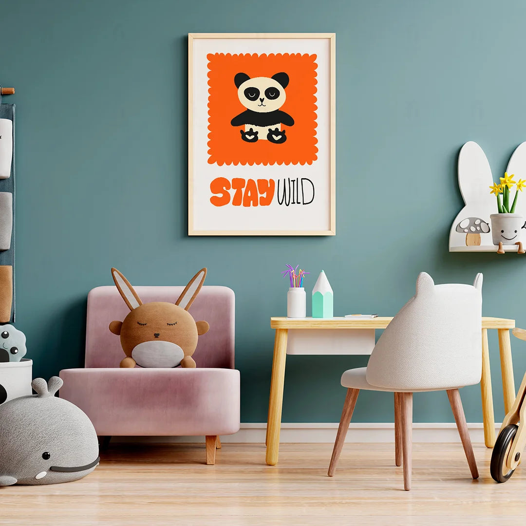 Liven up your child's room with the "Panda - Get Wild" poster. It features a cute panda against an orange square with the words "Get Wild" written on it, creating a lively and energizing atmosphere.
