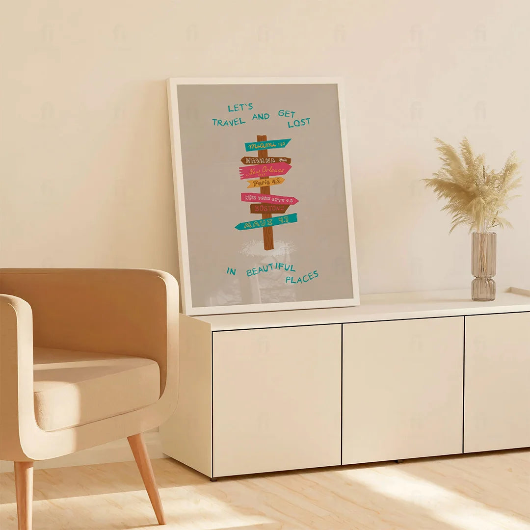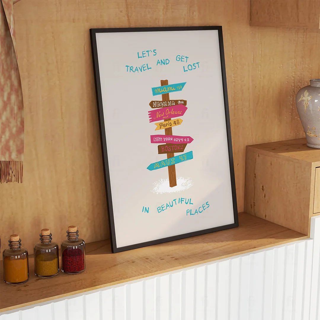 The poster "Let's Travel" invites you to travel together and get lost in beautiful places. Perfect for interiors that want to introduce the spirit of adventure and exploration of new places.