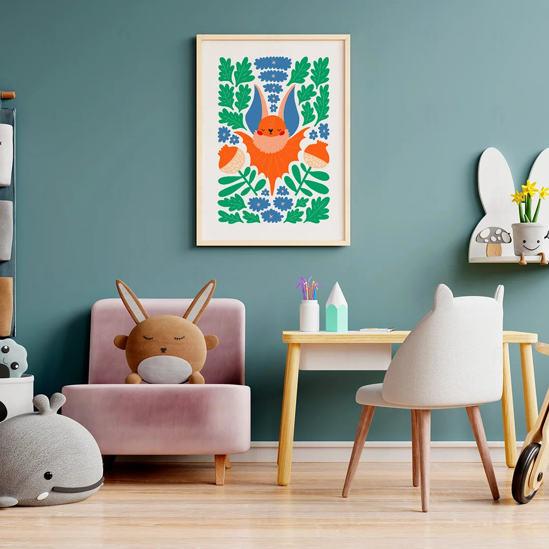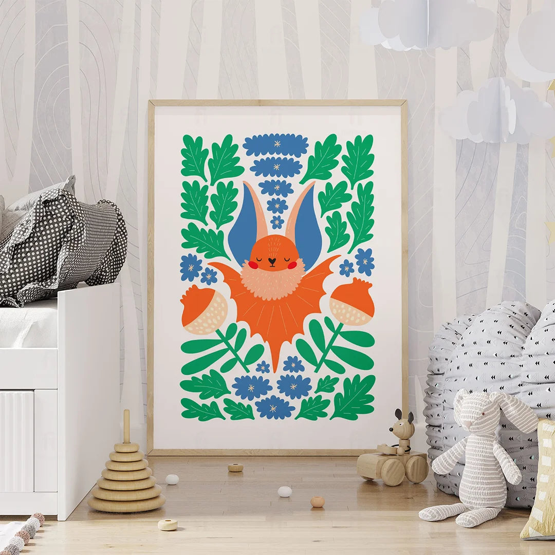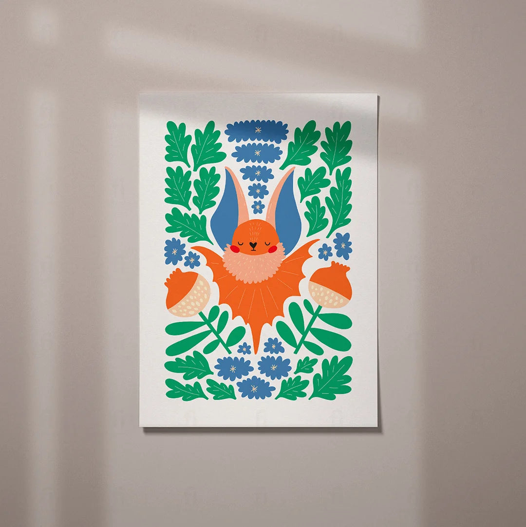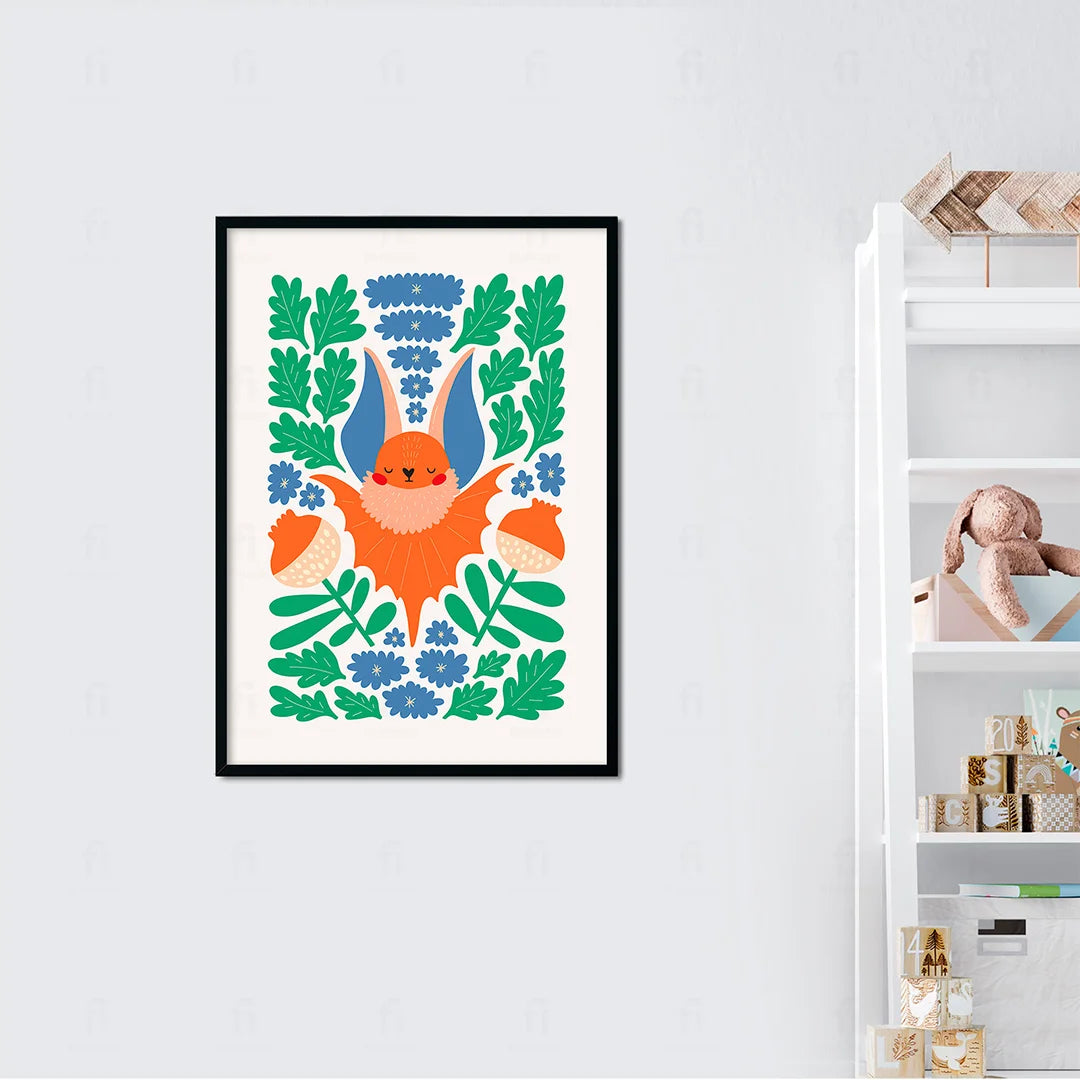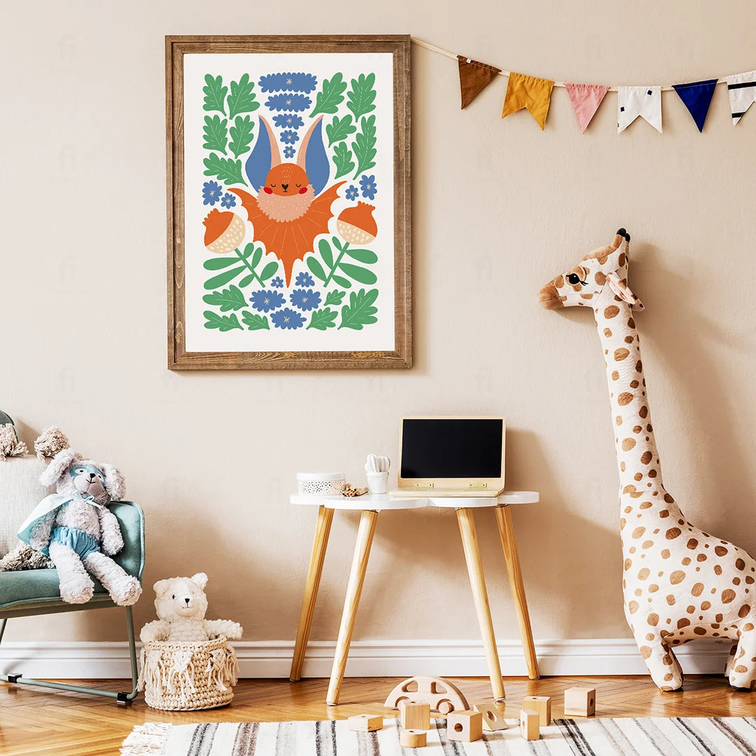 Add joy and color to your child's room with the "Joyful Bat" poster. It depicts an orange bat surrounded by green leaves and blue flowers, creating a friendly and joyful atmosphere.