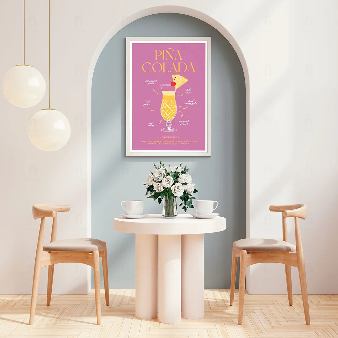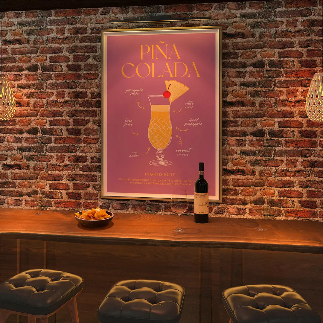 Decorate your home with the Pina Colada poster, which depicts the classic cocktail. Perfect for the kitchen, living room or home bar, where it can inspire you to prepare this delicious drink.