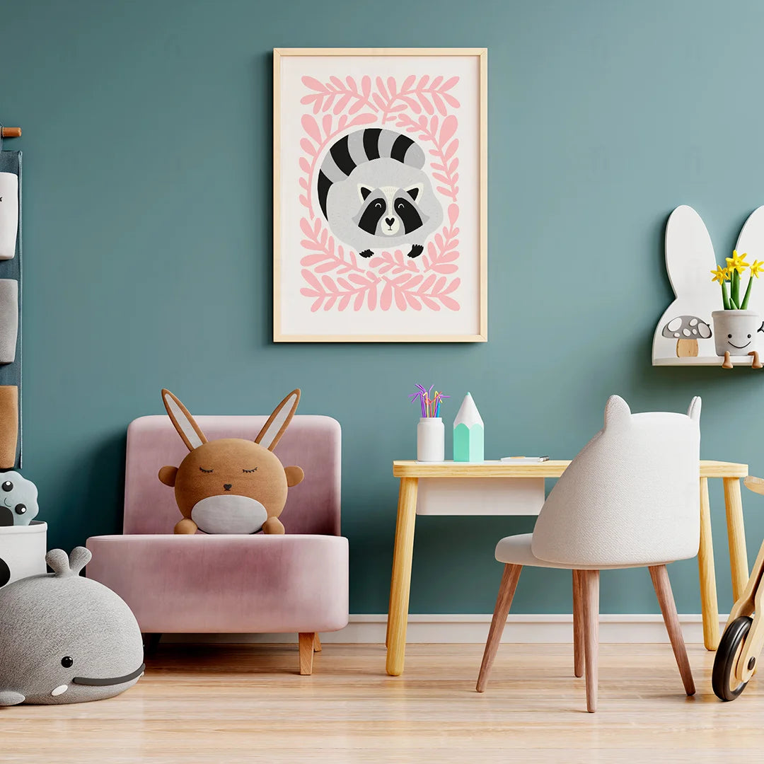 Add charm and color to your child's room with the charming "Sweet Raccoon" poster. The poster depicts a sweet raccoon surrounded by delicate, pink branches, creating a harmonious and friendly atmosphere