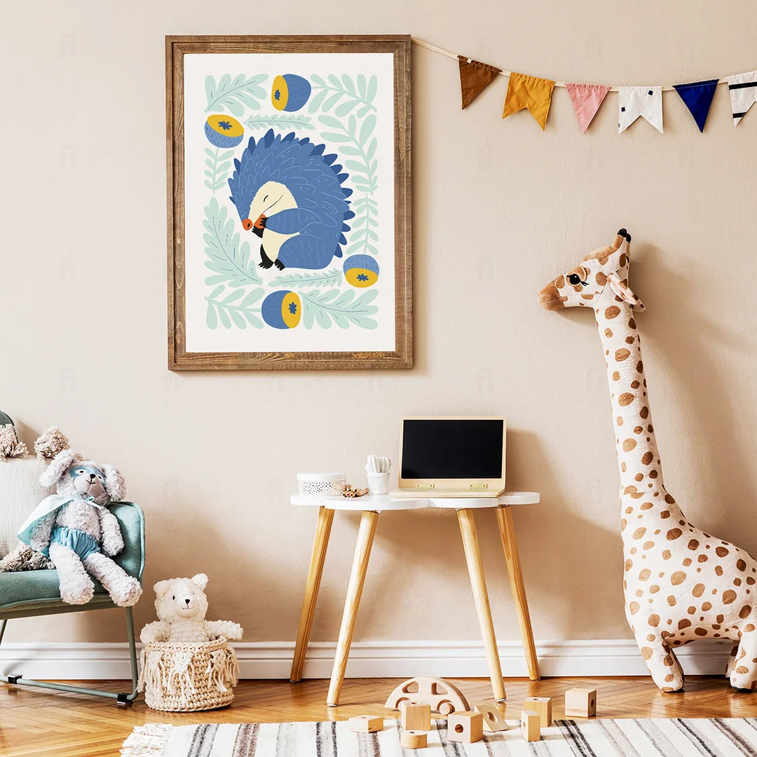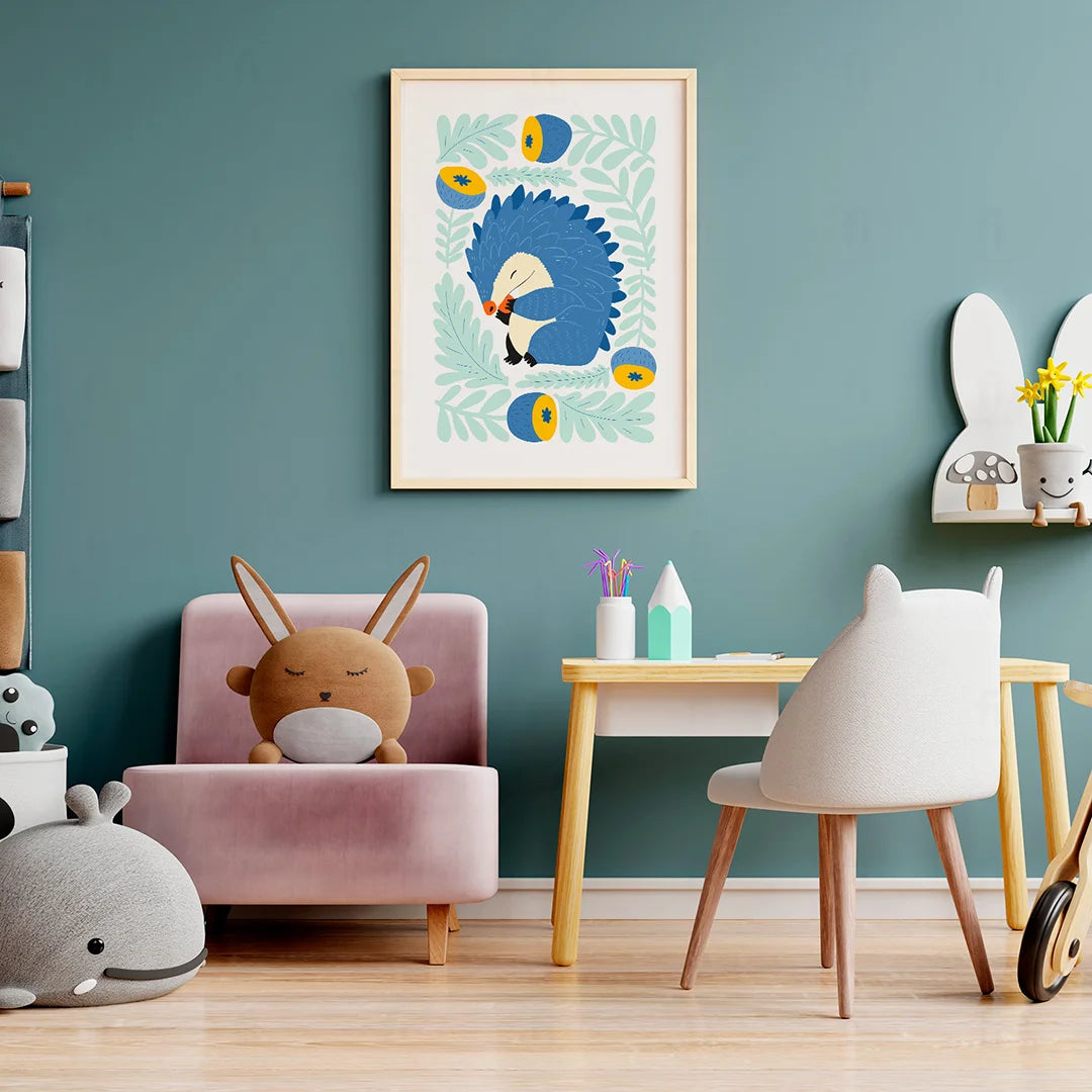 Add charm and peace to your child's room with the "Sleeping Hedgehog" poster. It depicts a sweet hedgehog surrounded by leaves and acorns, creating a harmonious atmosphere. Perfect for a child's room, nursery or play area, bringing peace and warmth.