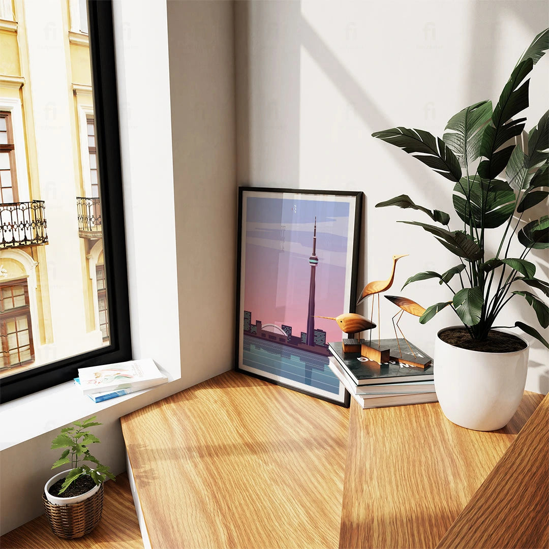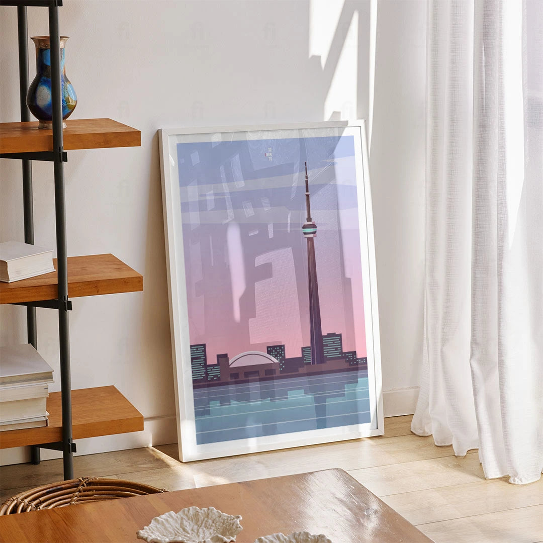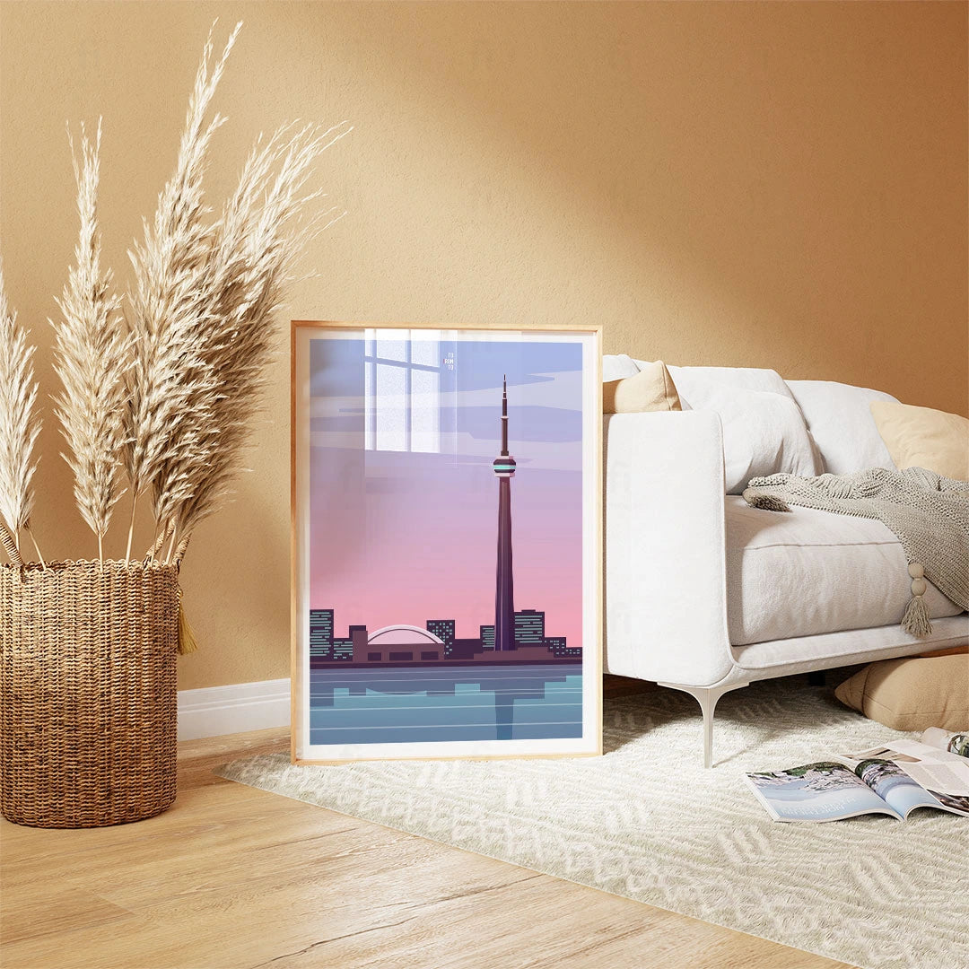 Get a taste of vibrant Toronto with our poster that shows the CN Tower against the city skyline at sunset. Perfect for lovers of urban landscapes and Canadian culture.